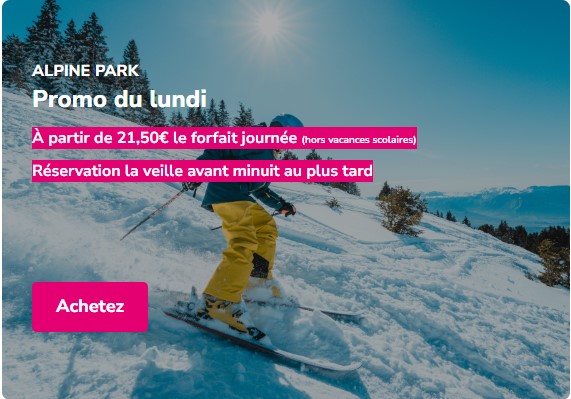 La PROMO DU LUNDI : Tous les lundis de l'hiver (hors vacances scolaires), profitez d'une journée de ski à seulement 33€ au lieu de 44€ (adulte), 26,50€ au lieu de 33,50€ pour un jeune ou étudiant ou senior et 21,50 au lieu de 28,50€pour un enfant. Alors n'hésitez plus, le lundi on skie ! Pour profiter de la réduction, le forfait promo du lundi devra être acheté au plus tard la veille.